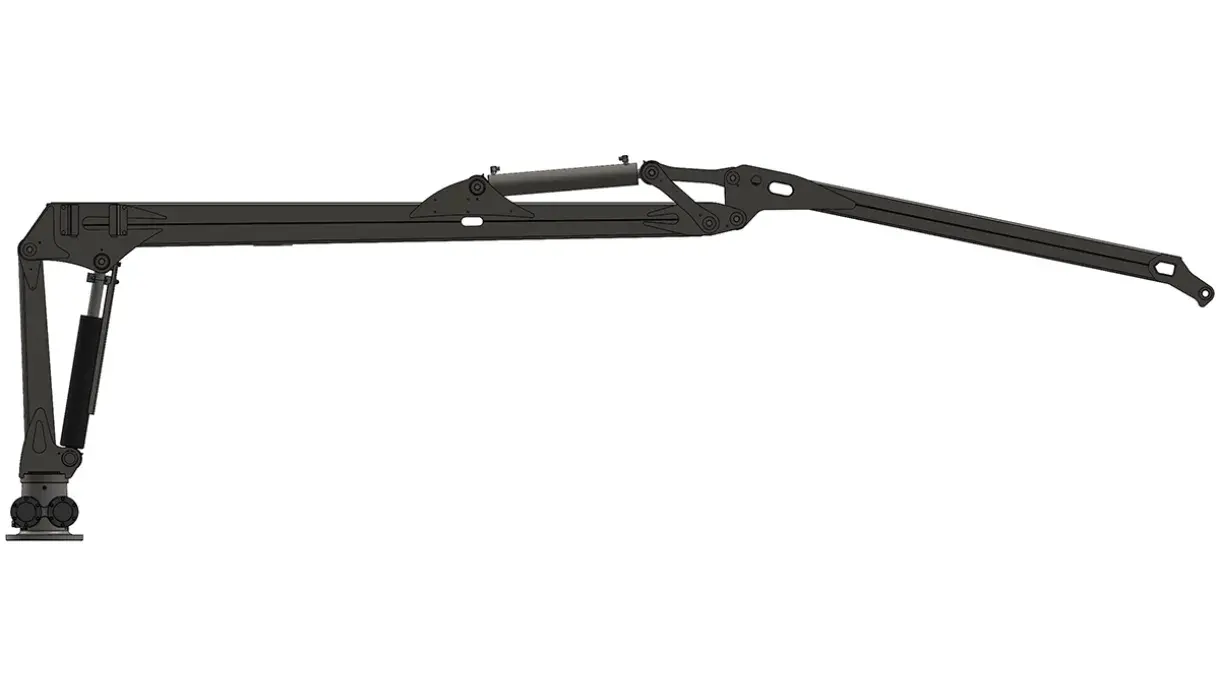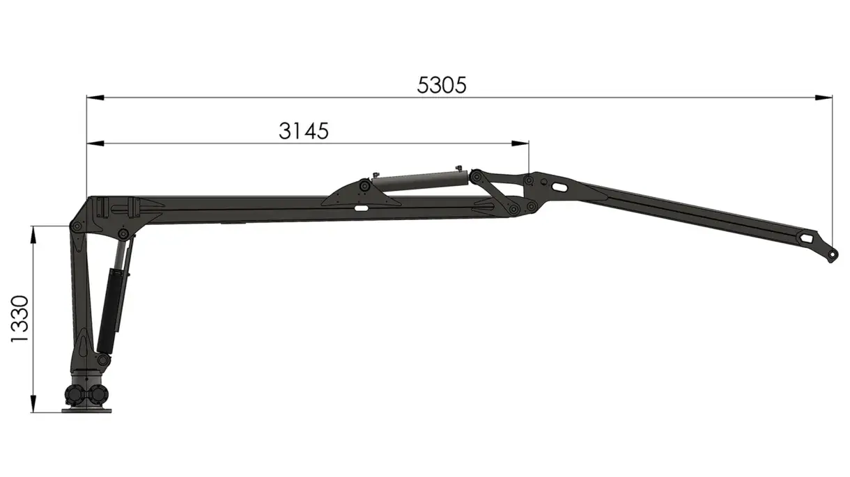 Cette grue a un rayon d’action de 5,3 m et peut soulever 615 kg à portée maximale, hors poids du grappin, du rotateur et de l’articulation.